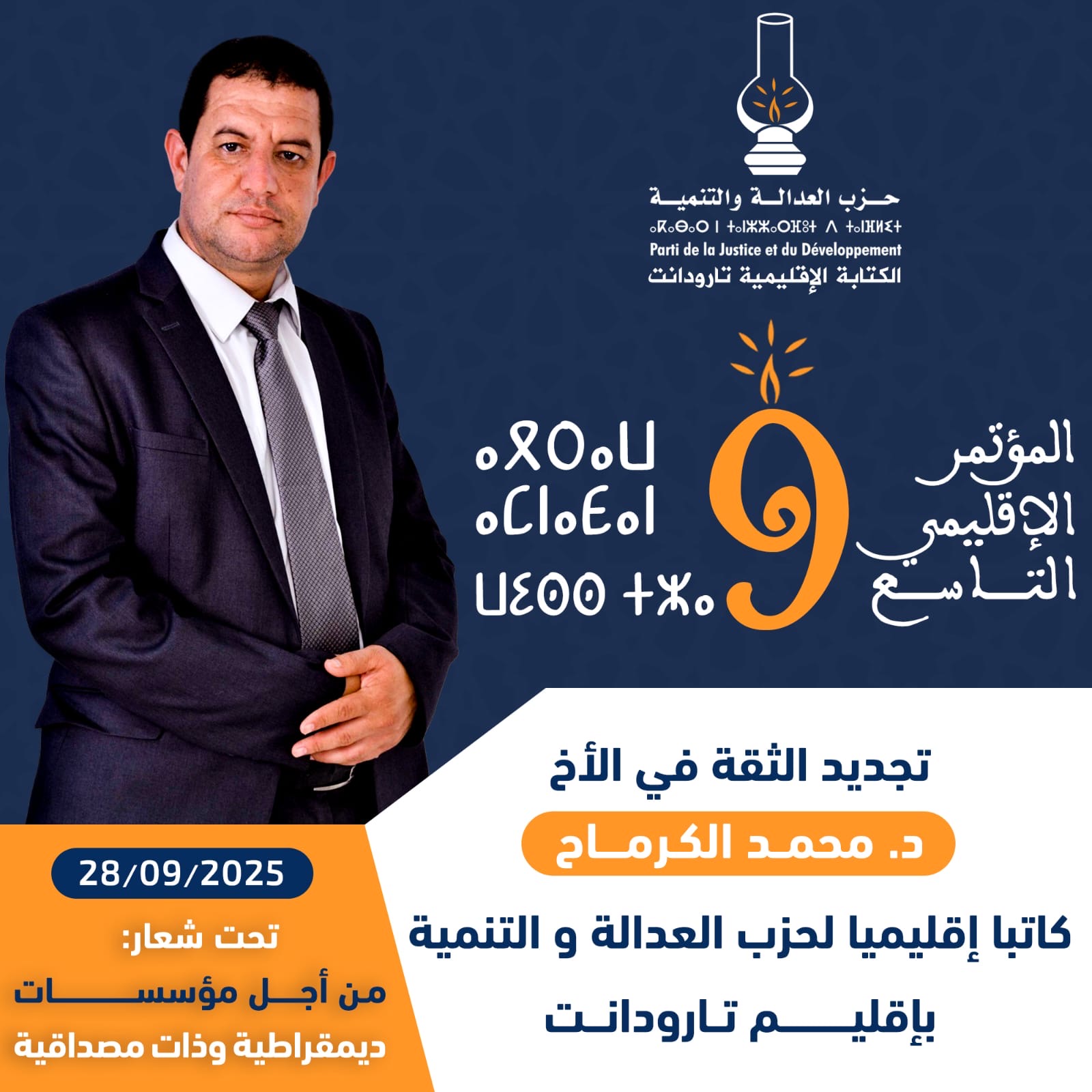 شهد المؤتمر الإقليمي التاسع لحزب العدالة والتنمية بتارودانت، المنعقد يوم 28 شتنبر 2025، تجديد الثقة في الدكتور محمد الكرماح كاتبًا إقليميًا للحزب. وقد جرى هذا الحدث التنظيمي تحت شعار: “من أجل مؤسسات ديمقراطية وذات مصداقية”، في أجواء تميزت بروح المسؤولية والنقاش الهادف بين مختلف المكونات الحزبية.