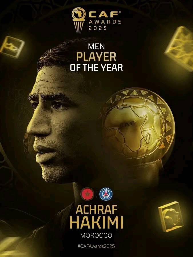 أعلن الاتحاد الأفريقي لكرة القدم، مساء اليوم، تتويج النجم المغربي أشرف حكيمي بجائزة أفضل لاعب أفريقي لعام 2025، خلال الحفل الكبير الذي تحتضنه العاصمة الرباط. وجاء تتويج لاعب باريس سان جيرمان بعد منافسة قوية مع المصري محمد صلاح والنيجيري فيكتور أوسيمين، ليواصل بذلك حضوره القوي في المشهد الكروي القاري والدولي.