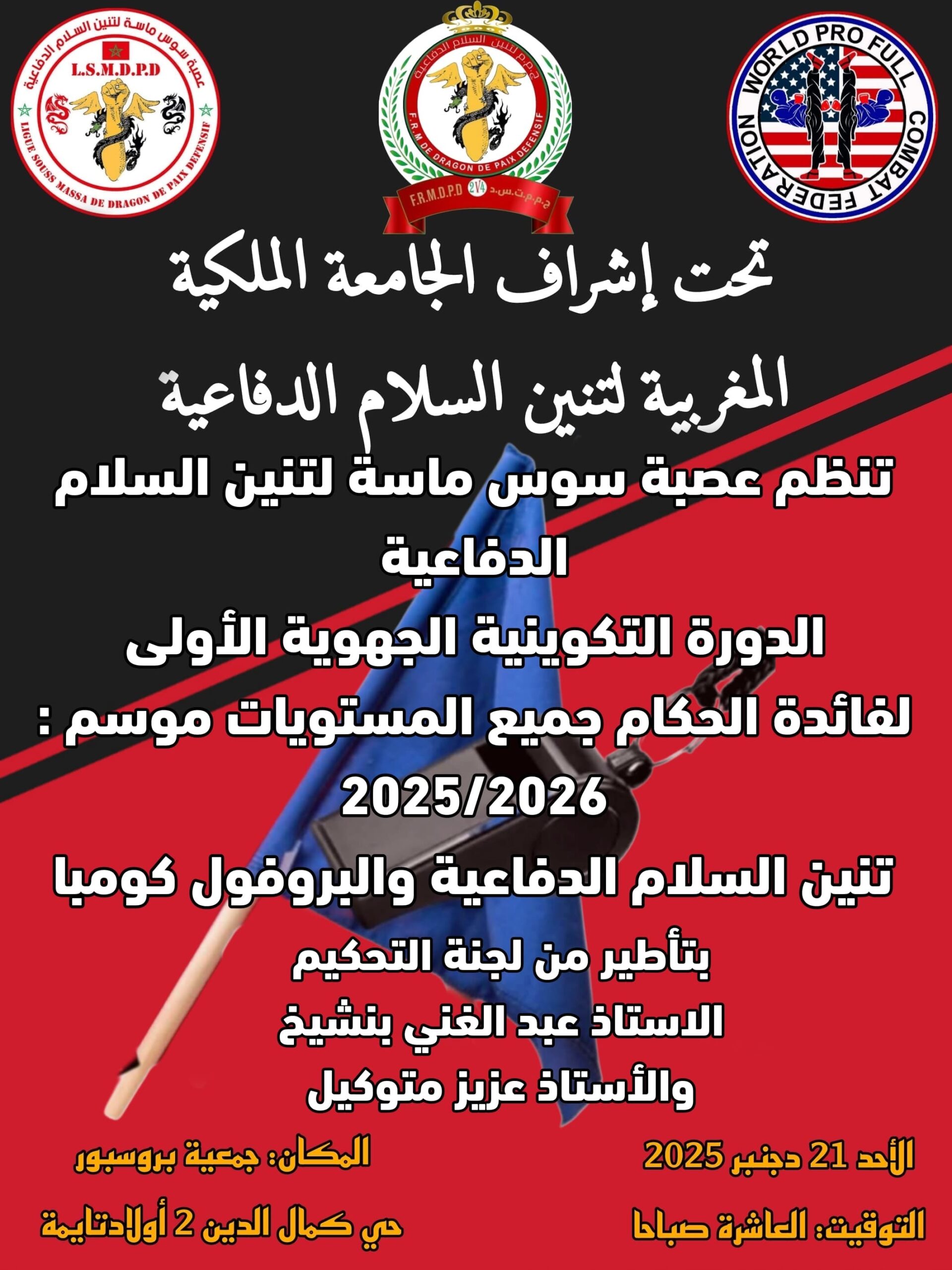 تحت إشراف الجامعة الملكية المغربية لتنين السلام الدفاعية، تنظم عصبة سوس ماسة لتنين السلام الدفاعية الدورة التكوينية الجهوية الأولى لفائدة الحكام من مختلف المستويات، برسم الموسم الرياضي 2025/2026. وتندرج هذه المبادرة في إطار تعزيز التأطير التقني والتحكيمي، والرفع من كفاءة الحكام لمواكبة تطور هذه الرياضة على المستويين الجهوي والوطني.