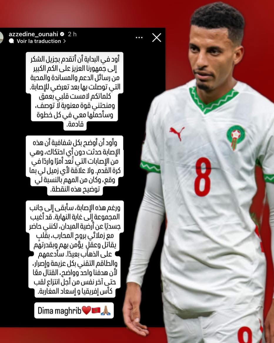 عز الدين أوناحي يطمئن الجماهير المغربية ويؤكد دعمه لزملائه رغم الإصابة