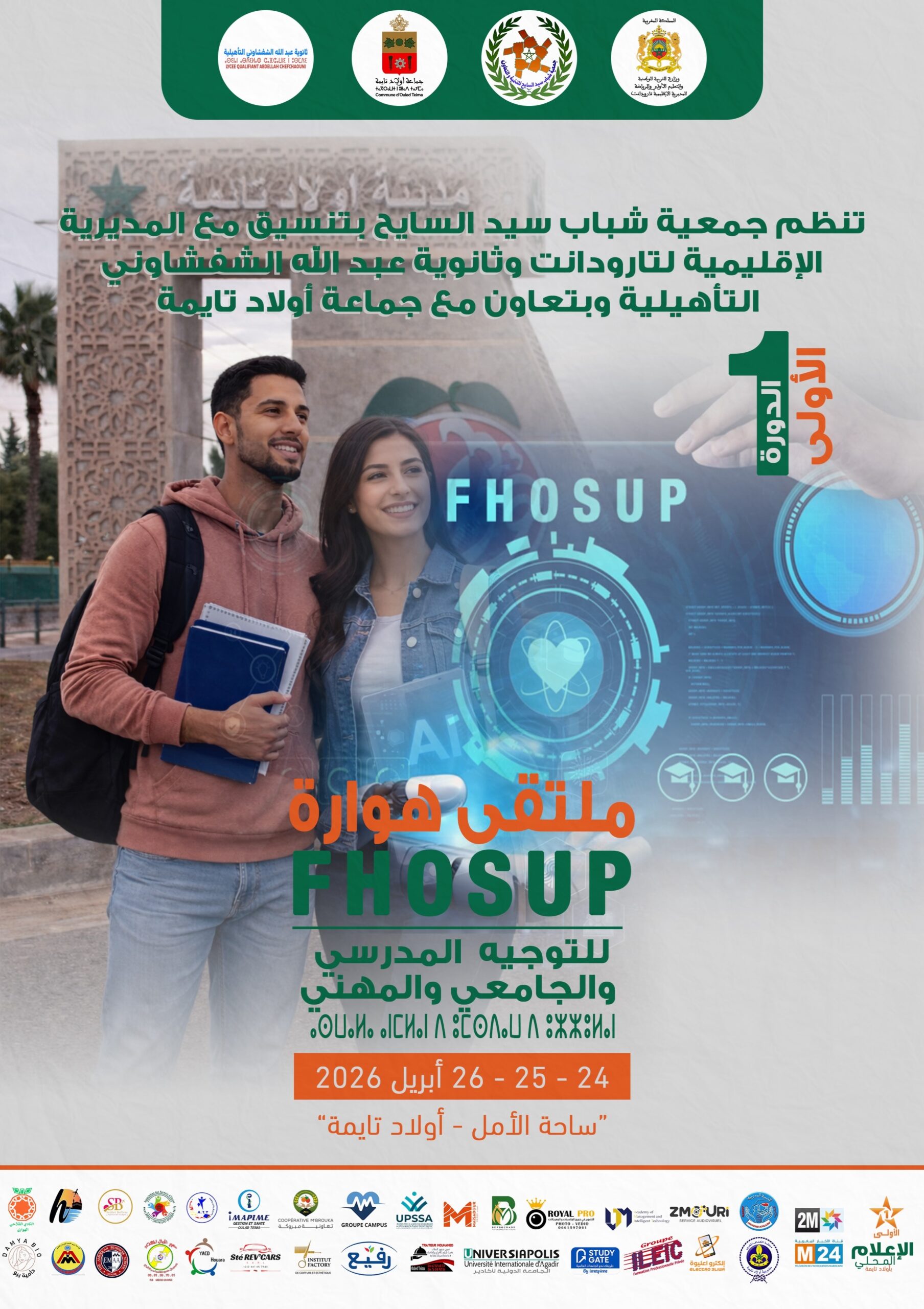 تستعد مدينة أولاد تايمة لاحتضان فعاليات “ملتقى هوارة للتوجيه المدرسي والجامعي والمهني FHOSUP”، الذي تنظمه جمعية شباب سيدي السايح بتنسيق مع المديرية الإقليمية لوزارة التربية الوطنية بتارودانت، وبشراكة مع ثانوية عبد الله الشفشاوني التأهيلية وجماعة أولاد تايمة. ويأتي هذا الحدث التربوي الهام في إطار دعم التلميذات والتلاميذ ومساعدتهم على رسم مساراتهم الدراسية والمهنية بشكل واعٍ ومدروس، عبر تقريبهم من مختلف الفرص المتاحة بعد البكالوريا.