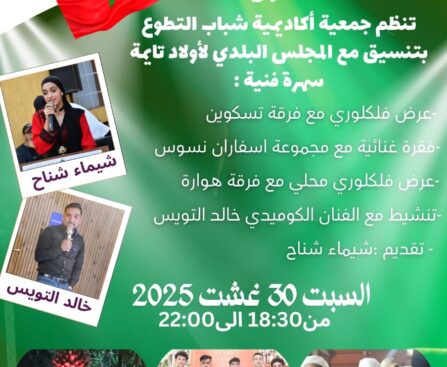 بمناسبة عيد الشباب المجيد، تستعد جمعية أكاديمية شباب التطوع بأولاد تايمة لإطلاق فعاليات النسخة الأولى من مهرجان الأحياء، من خلال تنظيم فقرة تنشيطية موجهة للأطفال، وذلك يوم السبت 30 غشت 2025 بساحة الشراردة “الجردة”، ابتداءً من الساعة الرابعة عصرا إلى السادسة مساءً. وسيكون الأطفال على موعد مع فقرة بهلوانية ترفيهية هادفة، تمزج بين الضحك […]