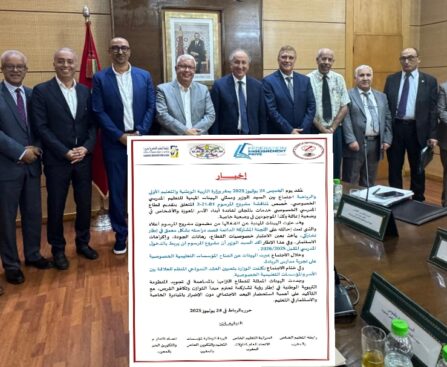 عقدت وزارة التربية الوطنية والتعليم الأولي والرياضة، يوم الخميس 24 يوليوز 2025، اجتماعاً مع ممثلي الهيئات المهنية للتعليم المدرسي الخصوصي، خُصص لمناقشة مشروع المرسوم رقم 2.21.81 المتعلق بتقديم خدمات تعليمية مجانية لفائدة أبناء الأسر المعوزة والأشخاص في وضعية إعاقة أو هشاشة. وقد عبّرت الهيئات عن انخراطها الإيجابي في هذا المشروع، مع تأكيدها على ضرورة دراسة […]