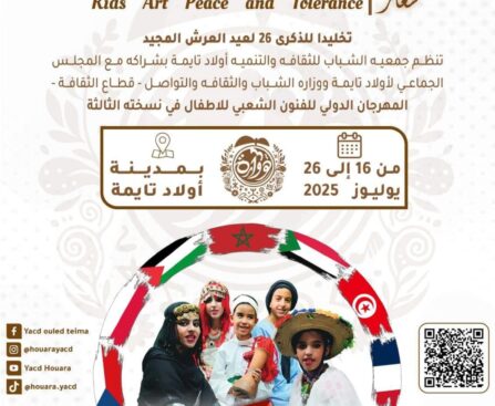 تستعد مدينة أولاد تايمة لاحتضان النسخة الثالثة من المهرجان الدولي للفنون الشعبية للأطفال، تزامنًا مع احتفالات الذكرى السادسة والعشرين لاعتلاء جلالة الملك محمد السادس العرش. هذا الحدث، المنظم تحت شعار “فن الأطفال سلام وتسامح”، سيجمع بين الثقافة والفن كأداة لتعزيز قيم الانفتاح والتسامح بين الشعوب، وذلك خلال الفترة الممتدة من 16 إلى 26 يوليوز 2025. […]